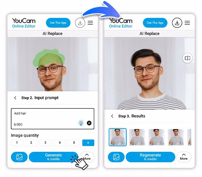 Utilizar YouCam AI Replace es increíblemente sencillo. Sigue estos pasos para transformar tus fotos con nuevos peinados en cuestión de segundos: