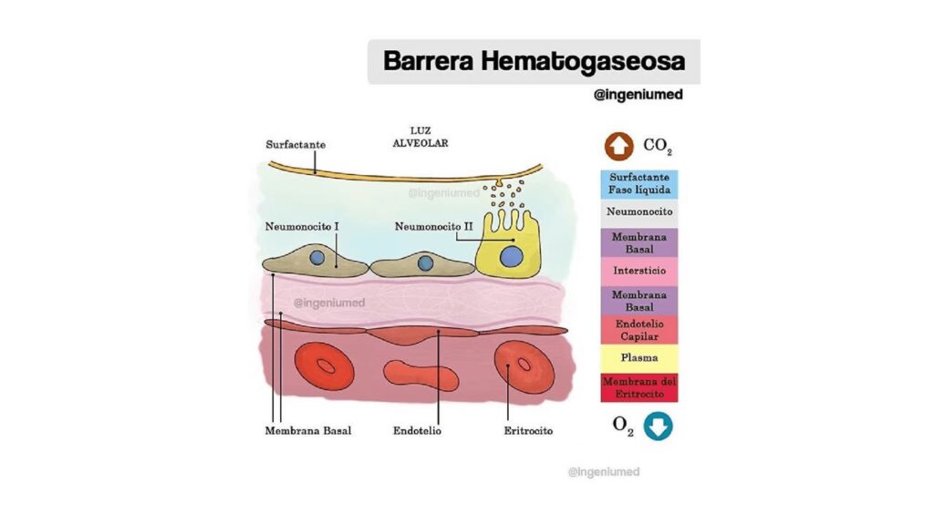 Cada uno de estos elementos contribuye a la función de la barrera, facilitando el paso rápido y eficiente del oxígeno hacia la sangre y del dióxido de carbono desde la sangre hacia el alvéolo para su expulsión.