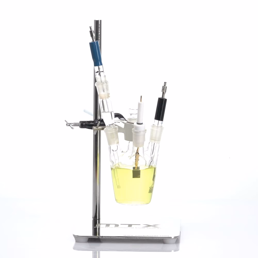 1. Preparación de la Celda: Primero, se ensambla la celda electroquímica convencional de tres electrodos, que típicamente es un recipiente de vidrio (como Pyrex) con aberturas para los electrodos.