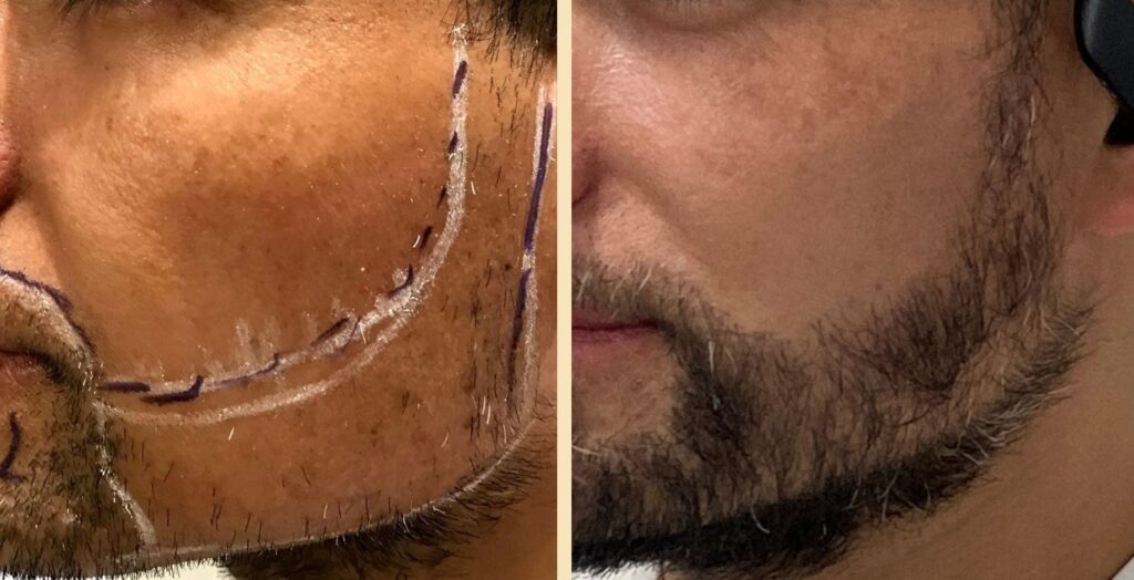 Implica la transferencia de cabello de un sitio donante, generalmente la parte posterior de la cabeza, a las áreas de la cara donde el vello facial es escaso o inexistente. Esto permite crear una barba completa, patillas, bigote o perilla, según los objetivos del paciente. El número de injertos necesarios varía según el tamaño del área tratada y las metas.