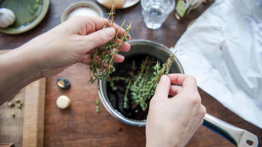Cómo usar el tomillo para fortalecer el cabello Solo necesitas hervir agua con ramas secas u hojas frescas, dejar reposar y aplicar sobre el cabello limpio. Este aclarado aporta brillo capilar, limpia profundamente y equilibra el pH del cuero cabelludo.