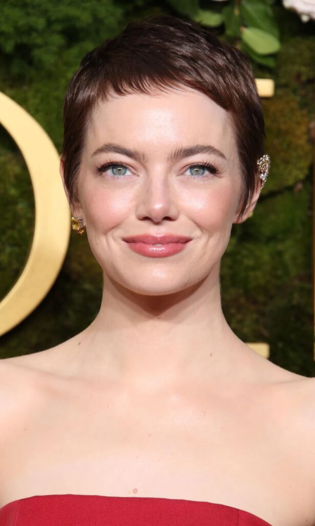 Según los expertos, los rasgos faciales de Emma Stone son tan juveniles y femeninos que el cabello corto no solo no los opaca, sino que los destaca aún más. No necesita el cabello largo para realzar su belleza, y el pixie subraya su delicadeza y estructura facial.