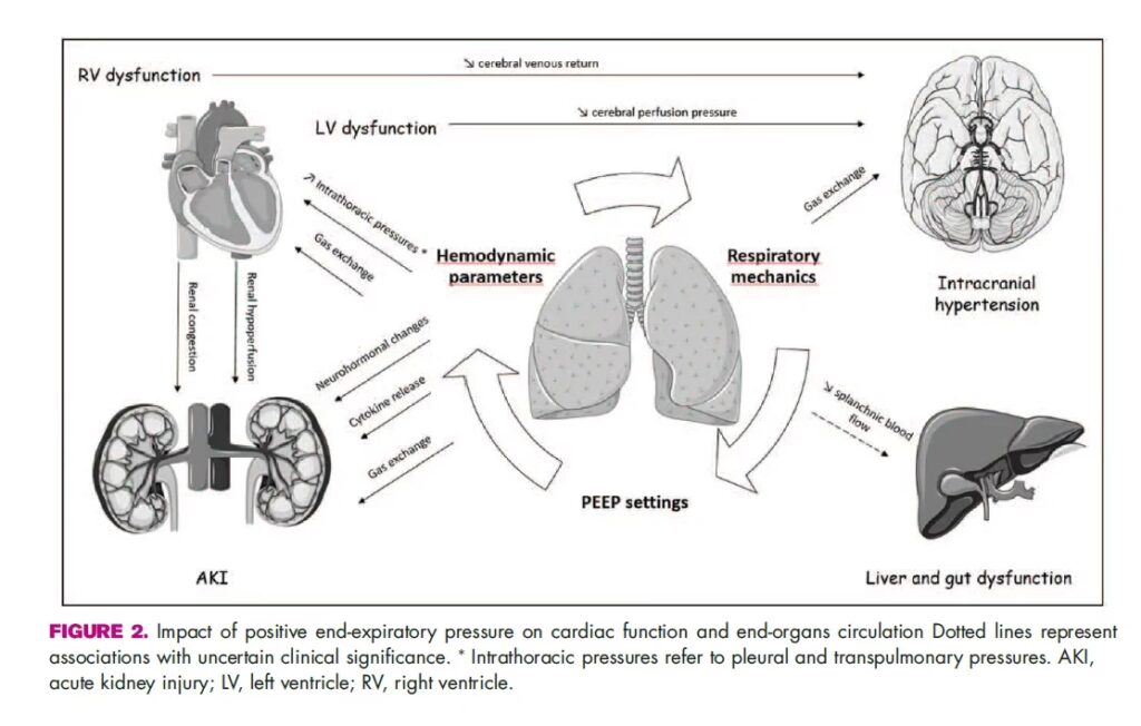 - Aumento de la postcarga ventricular derecha: El ventrículo derecho debe generar más presión para vencer la suma de la presión de la arteria pulmonar y la PEEP, lo que puede conducir a una falla ventricular derecha si la PEEP es demasiado alta o si el ventrículo ya está comprometido.