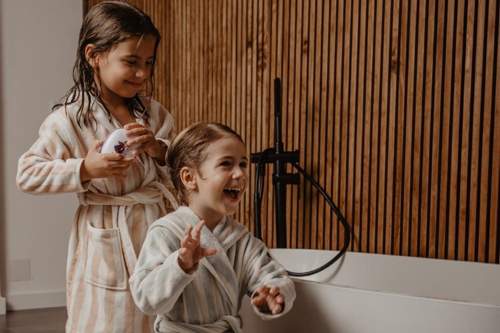 • Posición del lavado: Muchos niños toleran mejor inclinarse hacia adelante sobre un lavabo o una palangana para mojar y enjuagar el cabello, en lugar de acostarse en la bañera con la cabeza hacia atrás. Esta posición puede darles una mayor sensación de control y seguridad.