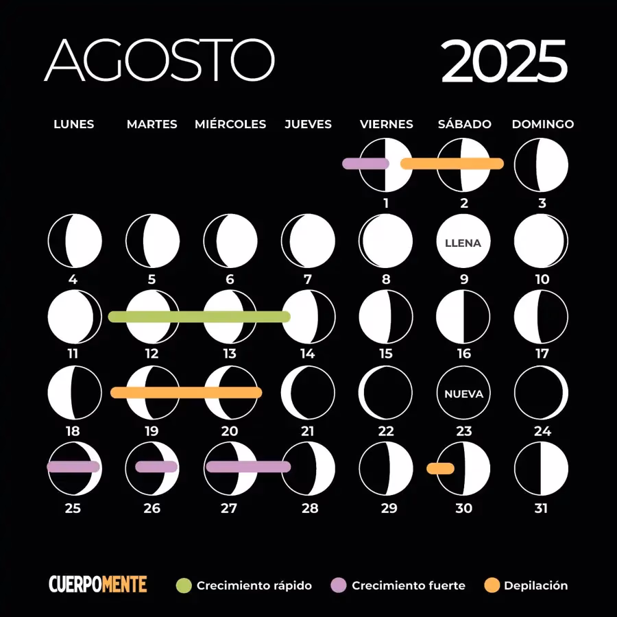 • Domingo, 11 de agosto: Inicia este periodo de energía ascendente. Un corte en este día puede estimular los folículos pilosos, incentivando que tu cabello brote con más fuerza y velocidad desde la raíz. Es un excelente día para refrescar tu corte y prepararlo para un rápido estiramiento.