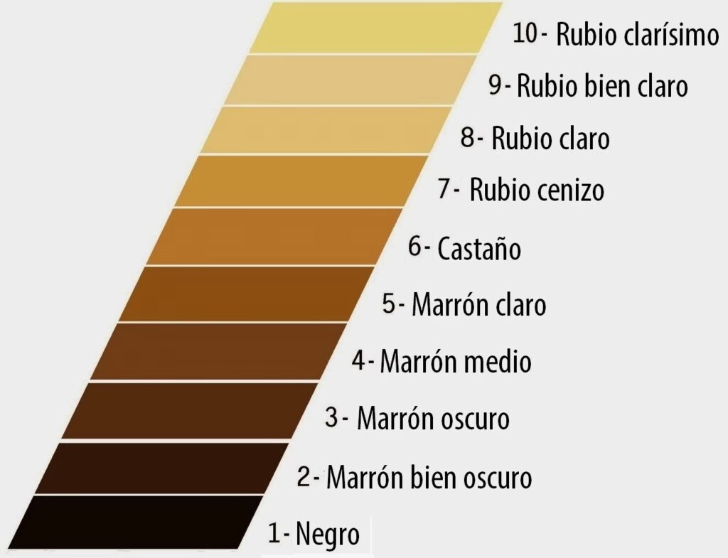 Nivel 1: negro Nivel 2: el segundo negro más oscuro Nivel 3: castaño/negro Nivel 4: castaño oscuro Nivel 5: castaño claro Nivel 6: rubio oscuro Nivel 7: rubio oscuro Nivel 8: rubio medio Nivel 9: rubio claro Nivel 10: blanco/platino.