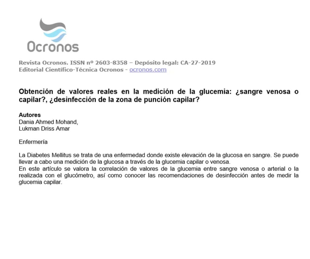 Finalmente, un estudio prospectivo evaluó otro medidor hospitalario POC de glucosa en sangre en muestras capilares y venosas, comparándolas con los valores de glucemia en laboratorio en pacientes con cetoacidosis diabética (CAD) o síndrome hiperosmolar hiperglucémico (SHH) ingresados en una UCI. Los valores de glucemia de laboratorio se correlacionaron fuertemente con los valores de glucosa POC, tanto en la muestra venosa (r = 0.98) como en la capilar (r = 0.96). Sin embargo, los valores de glucosa POC fueron consistentemente más altos que los de laboratorio (POC venosa 21 ± 3 mg/dl; POC capilar 30 ± 4 mg/dl). El aumento de la osmolaridad del plasma no afectó el error del POC, pero la acidemia (pH <7.3) se asoció con un mayor error del medidor, independientemente de los niveles de glucosa. A pesar de estas diferencias, se concluyó que, en general, los valores de glucosa en sangre (venosa y capilar) mediante el POC eran seguros para el propósito de titulación de infusiones de insulina en pacientes con hiperglucemia severa.