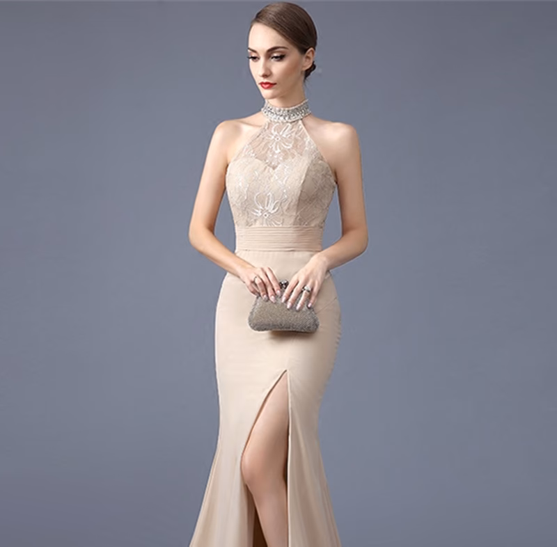 Los cuellos halter dirigen la mirada hacia arriba, resaltando tus hombros y cuello. Para evitar competir con el escote, mantén tu peinado simple y elegante. Una cola de caballo pulcra, un moño alto o el cabello liso suelto complementarán hermosamente el cuello halter. También puedes experimentar con una corona trenzada para un toque bohemio.