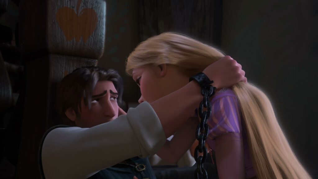 Este segundo corte es el más consecuente y visualmente impactante. A diferencia del primero, que fue un acto discreto y parcial, este es un corte total y público (dentro de la torre). Su cabello, que antes era su conexión con el mundo exterior y su único medio de escape (o al menos, de visitas), se convierte en un símbolo de su castigo y su abrupta expulsión de la torre. Es importante destacar que, a partir de este punto, el cabello de Rapunzel permanece corto durante el resto de la película, marcando un cambio permanente en su apariencia y, más significativamente, en su estado de ánimo y su viaje personal.